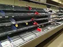 On February 26, Minister of Health Patty Hajdu recommended that citizens stockpile food and medication, noting that it was "good to be prepared because things can change quickly [in any emergency]."[98] The recommendation faced criticism from provincial politicians: Manitoba health minister Cameron Friesen and Ontario health minister Christine Elliott both felt that there was no need for such aggressive stockpiling, while Friesen also felt that there needed to be more coordination between the federal and provincial levels in terms of information regarding the outbreak.[99][100] Conservative Party shadow minister Matt Jeneroux opined that the suggestion incited concern and was lacking in transparency. Health Canada's website recommended against such bulk purchases (as to not strain supply chains), and explained that having supplies on hand was to "ensure you do not need to leave your home at the peak of the outbreak or if you become ill."[100][101]
