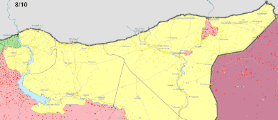 On 23 August, the Tabqa airbase was no longer encircled by ISIL fighters and the Syrian Army had taken back the M-42 Highway from ISIL fighters, which leads to the city of Salamiyah in the Hama Governorate.[267] Also in Raqqa, the Syrian Army took control of the town of Al-Ejeil.[268][269] ISIL reportedly sent reinforcements from Iraq to the governorate of Raqqa. The Syrian Observatory for Human Rights said at least 400 ISIL fighters had also been wounded in the previous five days in clashes with the Syrian Army and National Defence Force in Raqqa alone.[268][270] At the same time, several senior UK and US figures urged Turkey to stop allowing ISIL to cross the border to Syria and Iraq.[271] It was around this time that the Americans realized that the Turks had no intention of sealing their side of the border, and so Washington decided to work with the Syrian Kurds to close off the border on the Syrian side.[272] A year later, with the Kurds in control of most of the Turkey–Syria border, and the Syrian army advancing under Russian air support to seal the remainder, the situation was causing great ructions in Ankara.[273]