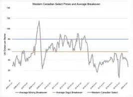 Graph outlining oil prices and breakevens for different extraction. methods used in Alberta.