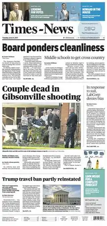 The Times-News was founded in 1887.[6] It joined Freedom Communications Inc. in 1978, and was sold to Halifax Media Group in 2012.[7] In 2015, Halifax was acquired by New Media Investment Group, which became Gannett in a 2019 merger.[8]