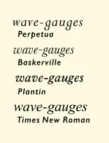Walter Tracy and James Moran, who discussed the design's creation with Lardent in the 1960s, found that Lardent himself had little memory of exactly what material Morison gave him as a specimen to use to design the typeface, but he told Moran that he remembered working on the design from archive photographs of vintage type; he thought this was a book printed by Christophe Plantin, the sixteenth-century printer whose printing office the Plantin-Moretus Museum preserves and is named for.[49] Moran and Tracy suggested that this actually might have been the same specimen of type from the Plantin-Moretus Museum that Plantin had been based on.[50] (Although based on a type in the collection of the Museum, the typeface Plantin is actually based specifically on a Granjon font for which matrices (moulds) only arrived in the collection after Plantin's death.[9]) The sharpened serifs somewhat recall Perpetua, although Morison's stated reason for them was to provide continuity with the previous Didone design and the crispness associated with the Times' printing; he also cited as a reason that sharper serifs looked better after stereotyping or printed on a rotary press.[51] Although Morison may not have literally drawn the design, his influence on its concept was sufficient that he felt he could call it "my one effort at designing a font" in a letter to Daniel Berkeley Updike, a prominent American printing historian with whom he corresponded frequently.[lower-alpha 10] Morison's several accounts of his reasoning in designing the concept of Times New Roman were somewhat contradictory and historians of printing have suggested that in practice they were mostly composed to rationalise his pre-existing aesthetic preferences: after Morison's death Allen Hutt went so far as to describe his unsigned 1936 article on the topic[3] as "rather odd…it can only be regarded as a piece of Morisonian mystification".[52]