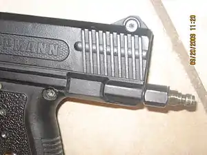 The Tippmann TPX features an area underneath its barrel for the operator to place 12 gram CO2 cartridges that provide velocity for paintballs to be shot out of the pistol. In this chamber the CO2 cartridge is held in place by a quarter turn cap that twists clockwise into place. Tippmann claims that the TPX punctures this cartridge when the user pulls the trigger of the marker for the first time, although there have been troubles reported with this feature.[4] The purpose of this design is to remove the cartridge from the paintball magazines. Removing the air cartridge from the magazine is meant to eliminate bulk from the pistol grip allowing it to be easier to hold.