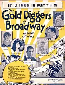"Crooning Troubadour" Nick Lucas topped the US charts with "Tiptoe Through the Tulips" in 1929, after introducing the song in the musical "talkie" film Gold Diggers of Broadway. Lucas's recording held the number 1 position for 10 weeks.[4] Other artists charted with the song in 1929, including Jean Goldkette (number 5), Johnny Marvin (number 11), and Roy Fox (number 18).