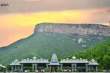 The city has many historical temples including the Venkateswara Temple which bears 1,150 inscriptions in Sanskrit, Tamil, Telugu and Kannada languages.[16] Out of 1150 inscriptions 236 belong to Pallava, Chola and Pandya dynasties, 169 belonged to Saluva dynasty, 251 belonged to Achyuta Deva Raya period, 130 belonged to Sadasiva Raya period and another 135 originated in Aravidu dynasty.[16][17] which specify the contributions of the Pallava Kingdom around the 9th century AD, Chola Kingdom around the 10th century AD and the Vijayanagara Empire in the 14th century AD.[18] During the 15th century, Sri Tallapaka Annamacharya sung many songs in praise of the holy town in Telugu. He compared it to be divine, including the rocks, streams, trees, animals, and adds that it is heaven on the earth. One example of such a song is:[19]