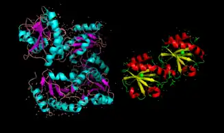 Recent studies have suggested that interferon-γ may serve as an activator of extracellular tTG in the small intestine; these studies have a direct implication to the pathogenesis of celiac disease.[12] Activation of tTG has been shown to be accompanied by large conformational changes, switching from a compact (inactive) to an extended (active) conformation. (see Figure 3)[23][25][26]