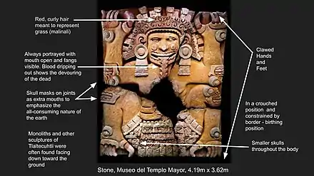 Other scholars, like Alfonso Caso, interpret this pose as a male Tlaltecuhtli crouching under the earth with his mouth wide open, waiting to devour the dead.[6] While one mostly encounters Tlaltecuhtli as female, some depictions are clearly male (though these distinctions may at times arise from the Spanish-language gendering process).[10] H.B. Nicholson writes, "most of the available evidence suggests that... the earth monster in the mamazouhticac position was conceived to be female and depicted wearing the costume proper to that sex. A male aspect of that deity was also recognized and occasionally represented in appropriate garb—but was apparently quite subordinate to the more fundamental and pervasive female conception."[11]