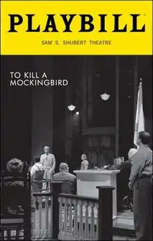 To Kill a Mockingbird is a 2018 play based on the 1960 novel of the same name by Harper Lee, adapted for the stage by Aaron Sorkin. It opened on Broadway at the Shubert Theatre on December 13, 2018. The play is set to transfer to London's West End at the Gielgud Theatre in 2021.[1][2] The show follows the story of Atticus Finch, a lawyer in 1930's Alabama, as he defends Tom Robinson, a black man falsely accused of rape.[3] Varying from the book, the play has Atticus as the protagonist, not his daughter Scout, allowing his character to change throughout the show.[4] During development the show was involved in two legal disputes, the first with the Lee estate over the faithfulness of the play to the original book, and the second was due to exclusivity to the rights with productions using the script by Christopher Sergel.[4][5] During opening week, the production garnered more than $1.5 million in box office sales and reviews by publications such as the New York Times, LA Times and AMNY were positive but not without criticism.[6][7][8][9]