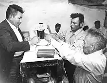 Another difference in gender roles among the Qom appears in the way in which men and women display aggression. Traditionally, men would not engage in physical violence using their fists or weapons to hurt one another but rather would fight through a series of challenges to determine who was stronger. In the case that physical fighting did break out, other men would not interfere. In fact, only the intervention of a woman, particularly one with close ties to one of the men involved, could end the fight.[58] However, for women, fights were often public and there was never any form of intervention. These fights were seen as spectacles and were often observed by various members of the group until one woman ceded or was sufficiently wounded. Additionally, women's fights differ from men's in the use of weapons. Traditionally, it was not uncommon for Qom women to use knuckle-dusters.[59] These weapons were made from wood or pieces of hide and sharp objects such as piranha teeth or sharpened rocks could be added in order to cause more damage to one's opponent.[59] Even among children, this difference between physical aggression between girls and boys has been observed in which young girls seem more aggressive and engage in physical fights more often than boys.[60]