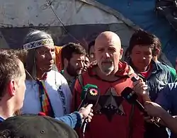 On November 23, the situation deteriorated when police were called in to forcibly disband the protest. The police burned down temporary shelters built alongside the road and violence erupted, resulting in the arrest of nearly 30 people, including some children. The same day, the Celía family would also come forward to claim the lands in question, bringing police with them to enforce their claim.[24] By the end of the night, two people, a policeman as well as a Qom man named Roberto López, had been killed and several others were hospitalized due to the conflict.[25] Díaz and other Qom protestors were even shot at by both the police and supporters of the Celía family.[26] As a result of the violent events that occurred on November 23, Díaz, as well as 23 other members of the Qom community, were accused of crimes of illegal occupation and usurpation of land and became involved in criminal proceedings against them.[24] In order to further protests and raise awareness of these inceidents, Díaz and other Qom moved their protest to the city of Buenos Aires. However, no public or governmental entity received the Qom other than Florencio Randazzo, an Argentine politician who worked as the Minister of the Interior from 2007 to 2015. Díaz was also received by Pope Francis who was concerned over the severity of the incidents. Despite this, threats towards the Qom community did not stop.[27]