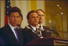 Faced with the prospect of defending multiple actions nationwide, the Majors sought a congressional remedy, primarily in the form of a national legislative settlement.[9] In June 1997, the National Association of Attorneys General and the Majors jointly petitioned Congress for a global resolution. On June 20, 1997, Mississippi Attorney General Michael Moore and a group of other attorneys general announced the details of the settlement. The settlement included a payment by the companies of $365.5 billion, agreement to possible Food and Drug Administration regulation under certain circumstances, and stronger warning labels and restrictions on advertising. In exchange the companies would be freed from class-action suits and litigation costs would be capped.[10]:422