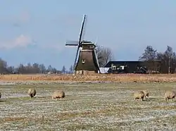 Tochmaland was built in to drain the 550 hectares (1,400 acres) Tochmaland polder. It was originally the sawmill Welgelegen, Veendam, Groningen. The mill was moved by millwright J B Donders of Tilburg, Noord-Brabant,[2] who had quoted a lower price for the move than millwrights from Kollum.It was formerly fitted with four Patent sails. The mill ceased working in 1946 when the windshaft broke and repair was deemed too expensive.[3] A brick shed containing an electrically driven Archimedes' screw was erected next to the mill.[4]