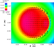An often cited description of the sawtooth relaxation is that by Kadomtsev.[2] The Kadomtsev model uses a resistive magnetohydrodynamic (MHD) description of the plasma. If the amplitude of the current density in the plasma core is high enough so that the central safety factor is below unity, a linear eigenmode will be unstable, where is the poloidal mode number. This instability may be the internal kink mode, resistive internal kink mode or tearing mode.[3] The eigenfunction of each of these instabilities is a rigid displacement of the region inside . The mode amplitude will grow exponentially until it saturates, significantly distorting the equilibrium fields, and enters the nonlinear phase of evolution. In the nonlinear evolution, the plasma core inside the surface is driven into a resistive reconnection layer. As the flux in the core is reconnected, an island grows on the side of the core opposite the reconnection layer. The island replaces the core when the core has completely reconnected so that the final state has closed nested flux surfaces, and the center of the island is the new magnetic axis. In the final state, the safety factor is greater than unity everywhere. The process flattens temperature and density profiles in the core.