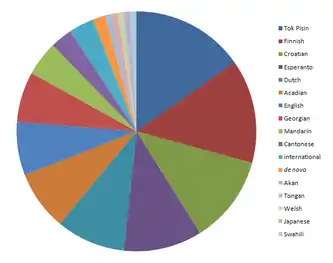 Although only 14 roots (12%) are listed as derived from English, a large number of the Tok Pisin, Esperanto, and other roots are transparently cognate with English, raising the English-friendly portion of the vocabulary to about 30%. The portions of the lexicon from other languages are 15% Tok Pisin, 14% Finnish, 14% Esperanto, 12% Croatian, 10% Acadian French, 9% Dutch, 8% Georgian, 5% Mandarin, 3% Cantonese; one root each from Welsh, Tongan (an English borrowing), Akan, and an uncertain language (apparently Swahili); four phonesthetic roots (two which are found in English, one from Japanese, and one which was made up); and one other made-up root (the grammatical particle e).[7]