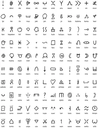 Besides the Latin alphabet, which is the most convenient and most used way of writing the language,[2] two logographic writing systems, sitelen pona and sitelen sitelen, were later introduced and included in Toki Pona: The Language of Good. The former, in which each word is represented by a symbol, was devised as an alternative by Lang herself.[4] It has been described as "a hieroglyphic-like script that makes use of squiggles and other childlike shapes"[20] . Proper names are written inside a cartouche-like symbol using a series of symbols, where each symbol represents the first letter of its word. Symbols representing a single adjective may be written inside or above the symbol for the preceding word that they modify. The symbol of the language is written in sitelen pona,[20] with the symbol for pona written inside the symbol for toki.