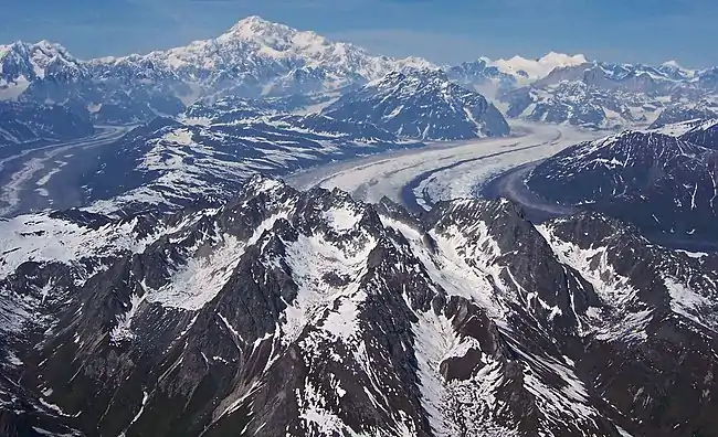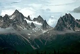 Tokosha Mountains is a 6,148 ft (1,870 m) multi-peak massif located in the Alaska Range, in Denali National Park and Preserve, in Alaska, United States. It is situated between the toes of Ruth Glacier and Tokositna Glacier, 27 mi (43 km) south-southeast of Denali and 26 mi (42 km) northwest of Talkeetna.[3] Despite its relatively low elevation, it is notable for its Teton-esque granite spires which can seen from the George Parks Highway.