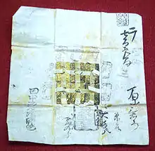 Regarding copper coins, the Kan'ei Tsūhō coin (Kyūjitai: 寛永通寶 ; Shinjitai: 寛永通宝) came to replace the Chinese coins that had been in circulation in Japan, as well as those that were minted privately, and became the legal tender.[5] This put an end to more than four centuries during which Chinese copper coins, obtained through trade or Wakō piracy, had been the main currency of Japan.[5]