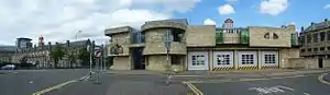 The name is presumed to derive from a crossroads where toll payments were collected from travellers entering the city, but the junction did not exist until modern times. In the 18th century a toll, appearing on maps as the Twopenny Custom, existed at present-day Main Point, at the top of the slope emerging from the Grassmarket where three centuries-old routes into the town from the West converged.[1] The custom, introduced in 1680, was a tax on every pint of ale and beer brewed outside the town walls. Main Point may therefore have been the original "tollcross", the name being transferred from the street known today as High Riggs to the modern junction some time after Lothian Road was laid in 1785 (see The Strangers Guide map of 1805 showing the area before Lothian Road was extended; and the Stevenson Map of 1837 showing the name's migration to the southern end of the street). A milestone opposite Merchiston Castle in Colinton Road marked "1 mile from Tollcross" has clearly been measured from Main Point rather than the modern junction. The other toll in the area, dating from 1792, in consequence of the 1755 Turnpike Act, was at the village of Wrightshouses, on the Wester Hiegait to Biggar (now Bruntsfield Place), roughly where the Barclay Church now stands. Its existence was recalled until recently in the name of the Auld Toll public house on the opposite side of the road before the pub was renamed in 2012.
