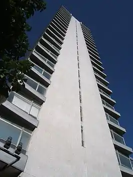 The principal shopping centre is situated west of the A3 in Tolworth Broadway, with the landmark Tolworth Tower,[39] at its junction with the A3. Tolworth Tower, built on the site of the former Tolworth Odeon Cinema[40] is an office block designed by George Marsh of R. Seifert and Partners[41] and opened in 1963.[42] The tower is 265 feet high with 22 floors. The ground floor of the building is occupied largely by a single retail unit, originally a Fine Fare[42] supermarket which traded until the early 1980s, and is currently a Marks and Spencer supermarket – and smaller retail units along the Broadway, the remainder taken up with access to the other floors. The remaining floors of the building were originally occupied by commercial and government offices, but the north wing has recently re-opened as a Travelodge hotel. The building is a local landmark and is the tallest building for miles around.