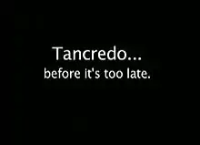 On November 13, the campaign released a controversial advertisement called "Tough on Terror" in which a hypothetical terrorist attack occurs in a shopping mall. The ad blames inept border security for the attack and flashes images of an injured child and a wrecked train. After Tancredo gives his approval for the message with the comment "I approve this message because someone needs to say it," a voiceover states, "There are consequences to open borders beyond the 20 million aliens who have come to take our jobs... the price we pay for spineless politicians who refuse to defend our borders against those who come to kill." [13] Since its release, the ad received criticism from some who called it "cheap" and "blatant fearmongering." Bowdoin College political scientist Michael Franz likened the advertisement to the Daisy ad run by Lyndon B. Johnson in the 1964 Presidential election claiming that the election of Barry Goldwater would lead to a nuclear war. The other Republican candidates in the race did not comment on the ad.[14]