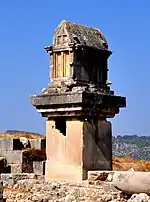 The tombs at Xanthos derived their form and decoration from multiple international sources.[6] The form of the pillar tomb was a distinctively Lycian architectural type.[6] Lycian, Greek, and Persian styles and iconographies combined in the relief sculpture of the tombs at Xanthos.[6] Lycian imagery included predominant Late Classical Greek ideas of art such as a connection with the viewer, individualist expressions, centralized power and wealth, and new definitions of divinity.[1] These themes can be seen through an examination of the relief sculpture of the monuments, specifically relating to the dynastic continuity between generations of Lycian rulers. Depictions of powerful individuals using styles from surrounding regions, even after the individuals's death, indicates cultural awareness and control.