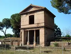 The Tomb of the Valerii (Italian: Sepolcro dei Valeri), which dates from the second half of the 2nd century AD, is a notable two-story brick structure. Its name is arbitrary and does not relate to the original occupants of the tomb. The part above ground has been almost entirely reconstructed and is noteworthy for a portico with two columns at the front. Beyond the entrance there is an area open to the sky from where two symmetrical staircases lead to the two underground burial chambers, which were originally richly decorated with slabs of marble.