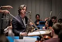 The next seven years were spent preparing for a much bigger orchestral work, the saxophone concerto Hiroshima (1998). This was premiered with the Orchestra of St. John Smith's Square at Chelmsford Cathedral and included strings, brass, woodwinds, percussion, piano, and saxophone. Smith appeared as solo saxophonist for Sally Beamish's The Knotgrass Elegy, commissioned for the 2001 BBC Proms, and performed with the BBC Symphony Orchestra at the Royal Albert Hall in London.[6] In 2002, Smith performed his earlier and much lengthier re-invention of Children's Songs for saxophone and orchestra with the Scottish Ensemble at St John's Kirk, Perth.[7] Other classical music endeavours have included a massive undertaking for the Edinburgh Youth Orchestra's 40th anniversary in 2003. A suite, entitled Edinburgh, was written for the occasion with saxophone, bass, drums, and a one hundred person symphony orchestra. The work toured Scotland, Estonia, Russia, and Finland