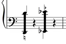 In his 1917 piece The Tides of Manaunaun, Cowell introduced a new notation for tone clusters on the piano and other keyboard instruments. In this notation, only the top and bottom notes of a cluster, connected by a single line or a pair of lines, are represented.[11] This developed into the solid-bar style seen in the image on the right. Here, the first chord—stretching two octaves from D2 to D4—is a diatonic (so-called white-note) cluster, indicated by the natural sign below the staff. The second is a pentatonic (so-called black-note) cluster, indicated by the flat sign; a sharp sign would be required if the notes showing the limit of the cluster were spelled as sharps. A chromatic cluster—black and white keys together—is shown in this method by a solid bar with no sign at all.[12] In scoring the large, dense clusters of the solo organ work Volumina in the early 1960s, György Ligeti, using graphical notation, blocked in whole sections of the keyboard.[13]