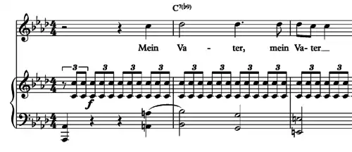 Writing about this passage, Taruskin (2010, p. 149) remarks on the “unprecedented… level of dissonance at the boy’s outcries…The voice has the ninth, pitched above, and the left hand has the seventh, pitched below. The result is a virtual ‘tone cluster’...the harmonic logic of these progressions, within the rules of composition Schubert was taught, can certainly be demonstrated. That logic, however, is not what appeals so strongly to the listener's imagination; rather it is the calculated impression (or illusion) of wild abandon.”[24]