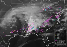 ![]() Map of tornado warnings and confirmed tornadoes from the outbreak with infrared satellite imagery of the storm system from the morning of April 14 | |