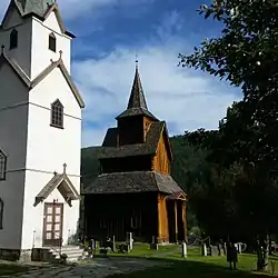 Built in 1192, the Torpo Stave Church is the oldest building within the valley and traditional district of Hallingdal. The church was dedicated to Saint Margareta. The stave church was purchased by the municipality in 1875. It was initially planned to expand it with an annex to the east, but in 1879 it was decided instead to modernize the interior with new ceiling and gallery. Following protest from the Ancient Monuments Society (Fortidsminneforeningen), the municipality decided to build a new church (Torpo Kyrkje) on the adjacent property. The new church was built north of the old one with the two churches standing side by side.[2][3]