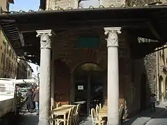 It was once sided by a ditch (a nearby church was known as San Jacopo dei Fossi, Italian for "St. James of the Ditches") and had some single mullioned windows, now replaced by normal windows. At the base is a small loggia from the 15th century, whose capitals show the Alberti coat of arms, featuring two crossing chains. After the Florentine branch of the family disappeared in 1836, it was owned by other families such as the Ubaldini and Mori. It was restored during the 1990s.