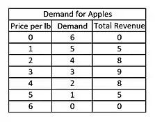 As with a perfect competitor, a monopolist’s total revenue is the total receipts it can obtain from selling goods or services to buyers. It can be written as , which is the price of the goods multiplied by the quantity of the sold goods. A monopolist's total revenue can be graphed as in Figure 1, in which Price (P) is the height of the box, and Quantity (Q) is the width. , (i.e., total revenue) equals the area of the box. Letting TR be the total revenue function: ,[1] where Q is the quantity of output sold, and P(Q) is the inverse demand function (the demand function solved out for price in terms of quantity demanded). Continuing to use Figure 1 as an example, price can be written as a function of quantity: , and be substituted into TR(Q) to get the TR function , which is a quadratic. In Figures 2 through 4, this function is shown graphically by using an example of demand for apples. The quantity of apples demanded drops as the price increases, which leads to the changes of the total revenue.