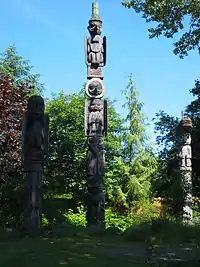 Totem poles (Haida: gyáaʼaang)[1] are monumental carvings, a type of Northwest Coast art, consisting of poles, posts or pillars, carved with symbols or figures. They are usually made from large trees, mostly western red cedar, by First Nations and indigenous peoples of the Pacific Northwest coast including northern Northwest Coast Haida, Tlingit, and Tsimshian communities in Southeast Alaska and British Columbia, Kwakwaka'wakw and Nuu-chah-nulth communities in southern British Columbia, and the Coast Salish communities in Washington and British Columbia.[1]