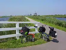 Road touring bicycles have a frame geometry designed to provide a comfortable ride and stable, predictable handling when laden with baggage, provisions for the attachment of fenders and mounting points for carrier racks and panniers.[1]