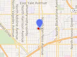 The theater is located in a neighborhood eponymously named the "Tower District".[6] It is located at the northwest corner of North Wishon and East Olive Avenues.[14] The building occupies 20,000 square feet (1,900 m2) of ground in an arrowhead shape. The auditorium, which forms the shaft of the arrow, is situated at a 45° angle to the streets and the two wings of the building contain retail space. The theater and parking lot originally covered a full 2.12-acre (0.86 ha) block.[8] In 1964, a 0.29-acre (1,200 m2) portion at the northeast corner was split off, leaving the theater property at 1.83 acres (0.74 ha). The separate parcel has been home to a service station and a restaurant. At the southwest corner is a non-contributing commercial building.[14]
