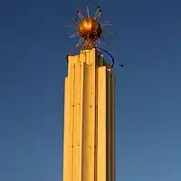 Building permits were issued on May 11, 1939, by the city of Fresno for a Wishon/Fox theater. Codenamed "The Ritz", the design was significantly smaller than the original Wishon/Fox proposal. It was designed by S. Charles Lee and was estimated to cost $100,000.[4] Construction began immediately following the issuing of permits under the direction of general contracting firm Trewhitt, Shields and Fisher.[4][5] The original design for a finned tower was revised by Lee in August 1939. The new 80-foot (24 m) design resembled the 130-foot (40 m) "Star Pylon" at the 1939 New York World's Fair, designed by Francis Kelly and Leonard Dean to symbolize the "force of electricity".[lower-alpha 1] On December 14, 1939, the theater, formally dedicated as the "Tower Theatre", opened to a private party for local dignitaries and people associated with Fox Theaters with a premiere of the film Balalaika.[4] It opened to the public the next day, featuring the films Dancing Co-Ed and Henry Goes Arizona. The theater was not certified as complete until January 29, 1940, but there was a push to occupy the building prior to Christmas 1939.[6]
