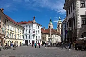 Town Square (Slovene: Mestni trg) is a major square in Ljubljana, the capital of Slovenia. Ljubljana Town Hall is located at the square. In front of Town Hall stands a copy of the Robba Fountain. Near the square, at Cyril and Methodius Square, stands Ljubljana Cathedral. Opposite Town Hall is the Krisper House, where Julija Primic, the inspiration of the Slovene Romantic poet France Prešeren, was born in 1816. The composer Gustav Mahler lived in the house from 1881 to 1882, when he worked as a conductor at the Carniolan Provincial Theatre at Congress Square.[1]