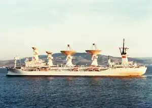 A tracking ship, also called a missile range instrumentation ship or range ship, is a ship equipped with antennas and electronics to support the launching and tracking of missiles and rockets. Since many missile ranges launch over ocean areas for safety reasons, range ships are used to extend the range of shore-based tracking facilities.