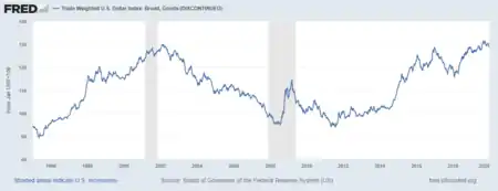 The trade-weighted US dollar index, also known as the broad index, is a measure of the value of the United States dollar relative to other world currencies. It is a trade weighted index that improves on the older U.S. Dollar Index by using more currencies and the updating the weights yearly (rather than never). The base index value is 100 in Jan 1997.[1]