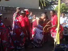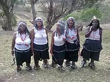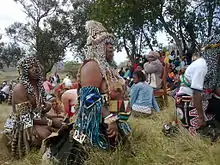 During the training period the ithwasa will share their ailments in the form of song and dance, a process that is nurtured by the analysis of dreams, anxieties, and with prayer. The story develops into a song which becomes a large part of the graduation-type ceremony that marks the end of the ukuthwasa training.[39] At times in the training, and for the graduation, a ritual sacrifice of an animal is performed (usually chickens and a goat or a cow).[40]