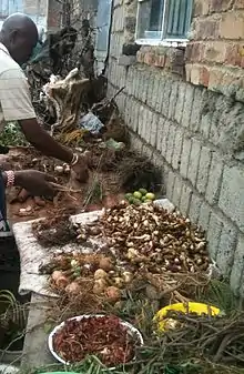 For harmony between the living and the dead, vital for a trouble-free life, traditional healers believe that the ancestors must be shown respect through ritual and animal sacrifice.[5] They perform summoning rituals by burning plants like imphepho (Helichrysum petiolare), dancing, chanting, channelling or playing drums. Traditional healers will often give their patients muti—medications made from plant, animal and minerals—imbued with spiritual significance. These muti often have powerful symbolism; for example, lion fat might be prepared for children to promote courage. There are medicines for everything from physical and mental illness, social disharmony and spiritual difficulties to potions for protection, love and luck.