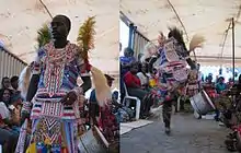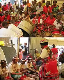Sangoma can also literally mean 'person of the drum' or 'the drumming one' [42] and drumming is an important part of summoning the ancestors. During times of celebration (e.g. at an Initiation) the possessed sangoma is called to dance and celebrate their ancestors. The sangoma will fall into trance(When in trance the Sangoma isn't conscious of what is happening, so after that he/she will be told of the things he/she had said) where the ancestors will be channeled (which is signified in Zulu traditions by episodes of convulsive fits) followed by the singing of ancestral songs. These songs are echoed back to the ancestor via the audience in a process of call and response. The possessed sangoma will then change into their traditional ancestral clothing and dance vigorously while others drum and sing in celebration.[17]