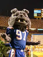 Some might say it's a coincidence that the two biggest wins in the program's Division I-A history had been decided in the south end zone under the watchful eyes of the Spirit of '88. However, the third time proved it was more than just chance. On a warm October 2 evening in 2004, Louisiana Tech found itself trailing No. 17 ranked Fresno State 21-20 late in the fourth quarter. Fresno State had the football and the momentum, trying to move out of its own end zone—the south end zone—against a Tech defense and its 12th man, or should we say Dawg. However, under the watchful eyes of the Spirit of '88, the Tech defense and offense would both strike. On third down Fresno State quarterback Paul Pinegar was intercepted by Byron Santiago who returned the football down to the 16-yard line. Two plays later, Ryan Moats gave Tech a 28-21 lead and the eventual win as he rushed eight yards to the right corner of the south end zone. The Bulldogs had defeated the 17th-ranked team in the nation. A Joe Aillet Stadium crowd celebrated wildly with the Tech players, coaches and the Spirit of '88. Some may say the powers of that bronze Bulldog are a fluke. Tech fans won't agree. The numbers say 59 wins and just 20 losses since the Spirit of '88 was unveiled. So fluke or not, the Bulldogs will continue to touch it each home game and hope the wins continue.[9]