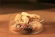 Gum tragacanth is a viscous, odorless, tasteless, water-soluble mixture of polysaccharides obtained from sap that is drained from the root of the plant and dried. The gum seeps from the plant in twisted ribbons or flakes that can be powdered. It absorbs water to become a gel, which can be stirred into a paste. The major fractions are known as tragacanthin, highly water soluble as a mucilaginous colloid, and the chemically related bassorin, which is far less soluble but swells in water to form a gel. The gum is used in vegetable-tanned leatherworking as an edge slicking and burnishing compound, and is occasionally used as a stiffener in textiles. The gum has been used historically as a herbal remedy for such conditions as cough and diarrhea. Powders using tragacanth as a basis were sometimes called diatragacanth.[5] As a mucilage or paste, it has been used as a topical treatment for burns. It is used in pharmaceuticals and foods as an emulsifier, thickener, stabilizer, and texturant additive (E number E413). It is the traditional binder used in the making of artists' pastels,[6] as it does not adhere to itself the same way other gums (such as gum arabic) do when dry. Gum tragacanth is also used to make a paste used in floral sugarcraft to create lifelike flowers on wires used as decorations for cakes, which air-dries brittle and can take colorings. It enables users to get a very fine, delicate finish to their work. It has traditionally been used as an adhesive in the cigar-rolling process used to secure the cap or "flag" leaf to the finished cigar body.[7]