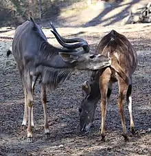 The spiral-horned antelopes are medium to large antelopes and generally are tall and long-legged. Horns are present in the males of all species, while females lack them with the exception of bongos and elands.[26][1][4] The horns primarily role is used for defensive horn-wrestling which are common during territorial disputes, as well has for horn soiling and sexual display.[26][1] Other examples of extreme sexual dimorphism can be seen among spiral-horned antelopes. Males are much larger in size than the females, and both sexes have very contrasting pelage coloration.[1] The coloration in females is generally tan to red-brown. Males area a darker hue of the female coloration, which they darken as the animal gets older.[26] Regardless of the coloration of the sexes, most species of spiral-horned antelopes have disruptive coloration that is a distinctive white vertical barring (striped pattern). A spotting pattern can occur as well.[26][1] Both patterns are individually and geographically variable. These patterns help them to conceal themselves in the dense vegetation from predators.[26][1] Most species have a white chevron between the eyes, spotted cheeks, the throat having a white patch and the upper-forelegs with dark garters.[26] All except the nyala and the greater kudu have a chest crescent.[26] In addition there are also physical attributes that serve a purpose in social communication such as dorsal crests, white scuts and white tips on the horns. These features help express the animal's emotions as well as alerting members of the herd from predators.[26][1] Underneath the hair fringe in the hind feet are special glands that encircles the false hooves.[26]