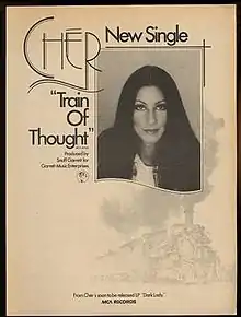 "Train Of Thought" is the second single released by an American singer/actress Cher from her 1974 album Dark Lady. It reached number #27 on the Billboard Hot 100 and #9 on the Adult Contemporary chart.[1] Allmusic retrospectively described this song as "raw and fast-moving rock."[2] Gene Pitney covered the song in 1976, but it didn't chart anywhere.