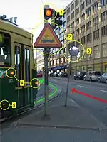 Structural design of trams can minimize the risks to tram drivers, tram passengers, pedestrians, and passengers in other vehicles in various kinds of tram-to-tram, tram-to-vehicle, and tram-to-pedestrian collisions.[19] A European standard is being prepared for crashworthiness for railway vehicle bodies.[20] The trams may contain emergency brakes. In Toronto the CLRV streetcars have a skirt added to the front of the car covering the coupler. It was added to prevent passengers from being dragged under the car's wheels. Trams should be designed to have impact absorbing materials in front and side constructions. Lifting points can be marked for fire brigades to help rescuers to find safe and strong enough parts of the tram when e.g. lifting a tram to rescue a patient underneath it. Inside the tram the structures should also contain impact absorbing materials and round shapes instead of sharp edges. Automatic door controlling sensors decrease the possibility of entrapment injuries. Common safety features onboard tram often include driver's vigilance control systems and programmable logic speed controllers.[21]