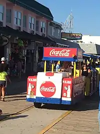 The Sightseers Tram Car (commonly referred to as the Tramcar) is a trackless train service running on the Boardwalk in the Cape May County, New Jersey communities of Wildwood and North Wildwood.[1] The service, which began on June 11, 1949,[2] takes passengers along the two-mile long Wildwood boardwalk. Service is available at all points along the boardwalk, from the beginning at Cresse Avenue to the end at 16th Avenue in North Wildwood.
