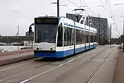 The fleet consists of about 200 trams, of which 155 are Combinos (types 13G and 14G) from Siemens. Older trams, types 11G en 12G built by La Brugeoise et Nivelles, operate on lines 5, 19 and 24. The latest trams that GVB has received are type 15G trams from Construcciones y Auxiliar de Ferrocarriles which run on line 25. Trams of types 11G, 14G and 15G are bi-directional for use on lines 5 and 25 which have terminals without turning loops.[2] All other tram lines have turning loops and use unidirectional trams.[2] Lines 25 (Amsteltram) and 26 (IJtram) can operate trams coupled in pairs; both lines run in a right-of-way mostly separated from road traffic.[4][5]