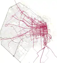 The first trams in Buenos Aires began operating in 1863 in what quickly became a vast network of tramways with the city being known as the "City of Trams" for having the highest tramway-to-population ratio in the world.[1][2][3] In the 1920s, Buenos Aires had 875 km (544 mi) of tramways and 99 tram lines using 3000 carriages running throughout the city.[2][3] By 1963, the vast majority of the network began to be dismantled, though some minor tram services continue in the city today.
